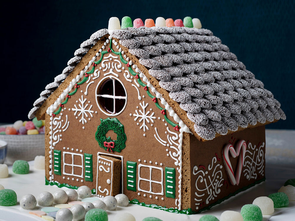 «Черепица» из миндальных лепестков, штампованные рисунки, объёмные айсинговые полосы, крыши из плиточного шоколада.
