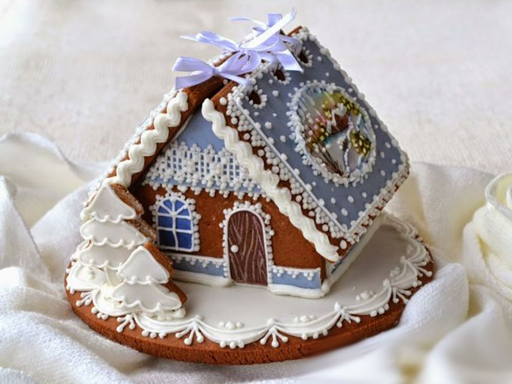 Оформление простое, но с одной яркой деталью: венок, объёмная снежинка, окошко из карамели.